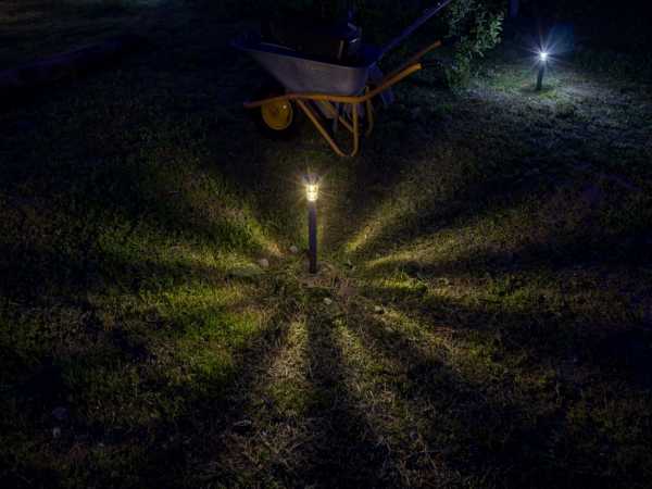 Такой уличный светильник для сада лучше всего установить на открытом месте, чтобы он мог заряжаться от солнечного света. В конструкцию встроен фотоэлемент, который преобразует солнечную энергию в электрическую, а она, в свою очередь, накапливается на аккумуляторах, установленных в электрической цепи.