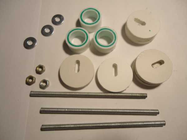 Собираем плафон при помощи пластиковых шайб диаметром 28 миллиметров с прорезью, проставки из отрезка любой пластиковой дюймовой трубы длиной около 10 мм, шпильки, шайбы и гайки М4: