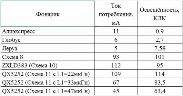 Ввиду того что потребление схемы с указанными номиналами составляет 100 – 110 мА, фонарик основанный на данной схеме чтобы светить до рассвета в течении всего дачного сезона должен устанавливаться только на открытое пространство без затенения от построек и деревьев, но на практике это не всегда возможно. Поэтому несмотря на появление в магазинах одной далёкой страны солнечных панелей с размерами 50х80 мм и заявленным током в 300 мА, в ряде случаев возможно придётся умерить аппетиты и уменьшить потребление фонариков. Для того чтобы посмотреть на сколько при этом уменьшится яркость, в двух фонариках ток потребления был уменьшен путём увеличения номиналов токозадающих дросселей, в одном до 67 мА (L1 = 33 мкГн), в другом до 45 мА (L1 = 47 мкГн). Перед окончательной сборкой их яркость была измерена люксометром, результаты приведены в таблице (схемы 8, 10, 11 приведены в статье «Солнечные фонарики – нам надо ярче»):