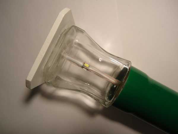 | Тюльпан оказался герметичным снизу и в сезон дождей его корпус полностью наполнился водой. Разбавленный в воде активный флюс успел растворить ножку светодиода, а также вывел из строя выключатель. После чистки ватным тампоном, смоченным в ацетоне и замены светодиода, фонарик заработал. |