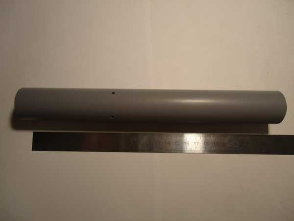 Электронику и АКБ в фонарике можно разместить непосредственно в плафоне, если его размеры позволяют, или в стойке. Про фонарики с электроникой в плафоне мы поговорим в следующий раз, для них стойка представляет собой просто крашеную трубу подходящего диаметра, а на примере серой ПП трубы диаметром 30 мм я покажу как изготавливается стойка для фонарика с отсеком под электронику. В уже отрезанной по длине заготовке на расстоянии 9 — 10 см от верха сверлим четыре отверстия диаметром 2 — 3 миллиметра для слива конденсата из будущего батарейного отсека: