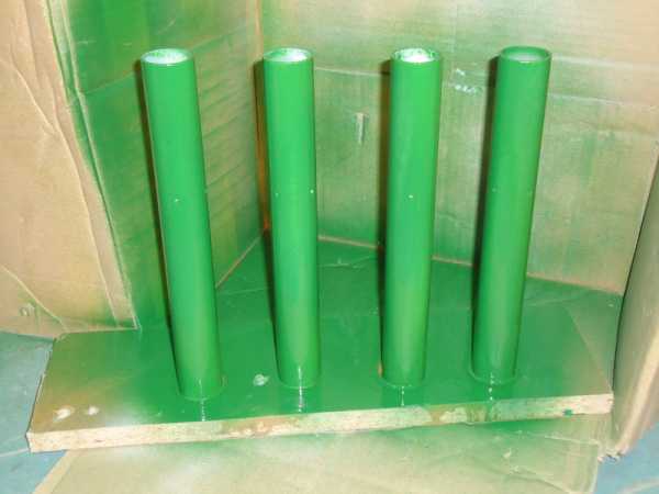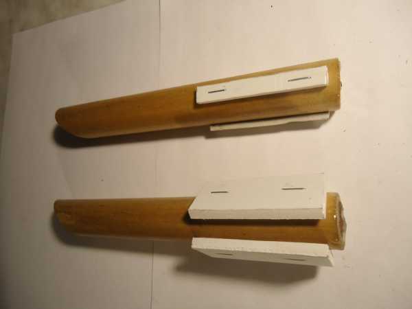 Если в качестве стойки используется труба внутренним диаметром больше 24 – 30 мм, то для чтобы колышек в ней болтался, можно изготовить проставки, например из листового ПВХ пластика подходящей толщины, прикрепив их при помощи степлера, или мелких обойных гвоздиков. Вот как это выглядит для 40 мм и 50 мм стоек: