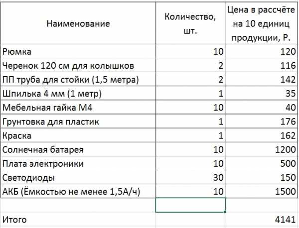 В заключение поговорим во сколько же обходится один фонарик. Основные материалы и комплектующие в расчёте на изготовление десяти фонариков без учёта мелочёвки в виде лака, проводов и пластика приведены в таблице: