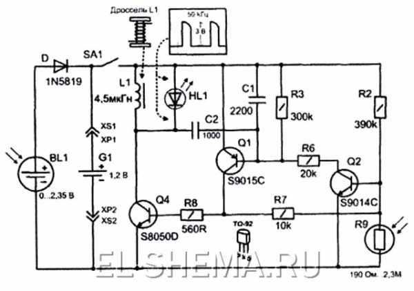 Помимо этого можно посоветовать применить вместо одного светодиода три сверхярких, включенных в паралель, хотя это сократит время свечения светильника с 8 часов до 4-6. Можно пойти другим путем — заменить дроссель на более мощный и диод на матрицу из 4 диодов. Эта модернизация также сокращает время свечения прибора в темное время суток. Если же эксперименты привели к поломке электронной части изделия, то ремонт можно произвести только полностью заменив электронную начинку (ведь микросхемы с такой маркировкой не продаются ни в одном из российских радиомагазинов). Можно полностью заменить внутреннюю схему, применив разработку инженеров из Дании и построив транзисторный преобразователь.