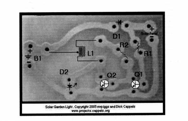 Электрическая схема светильника на солнечной батарееТакже понадобится плата, которая вытравливается по определенной схеме.