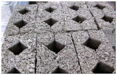 - Для достижения лучших теплоизоляционных показателей. Смесь делается из щепы, вяжущего (цемент с добавками) и воды в пропорции 1:1:1,5. Если нужен более прочный блок для стены с высокой несущей нагрузкой, то пропорции вяжущего соответственно меняются