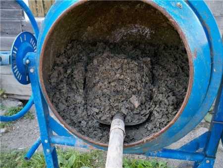 - Соединение компонентов. Вначале соединяют щепку и цемент. Сделать это вручную лопатой не получится, допускается только длительный замес в бетономешалке.