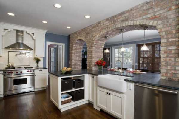 Оформить арку можно в любой комнате в квартире, даже на кухне. Например, сделать арку над барной стойкой, дополнив ее держателями для бокалов. Также на кухне в стиле кантри или прованс можно оформить арку над кухонной плитой, замаскировав таким образом вытяжку. Такую арку можно декорировать искусственным или натуральным камнем.