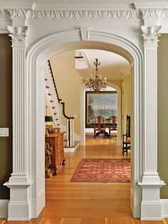 Декорирование арки колоннами будет уместно смотреться в интерьере просторной квартиры или загородного дома. Форма колон повторяет общий стиль в интерьере и может быть дополнена декоративными элементами, например лепнинами.