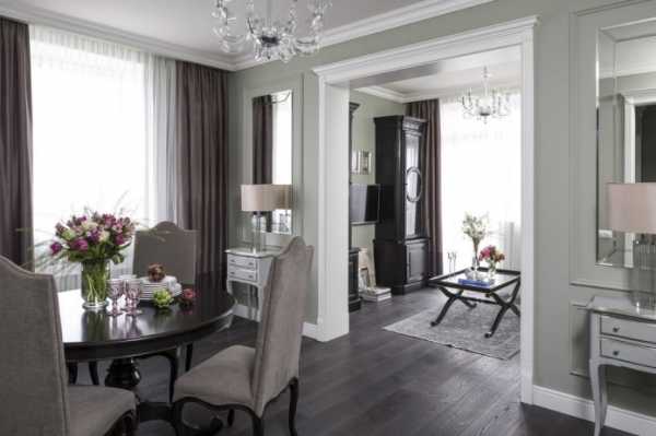 На фото интерьер квартиры в стиле новая классика. Стены отделаны штукатуркой в сером цвете.