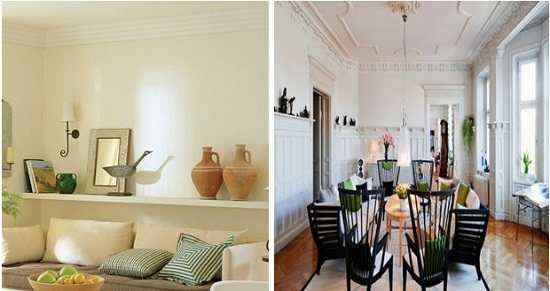 Нередко интерьер в этих комнатах дополняется украшениями из колонн, багетов и гипсовых лепок. Широкий полиуретановый плинтус это не просто красиво, но и практично, так как с помощью него от внешнего воздействия защищается стена.