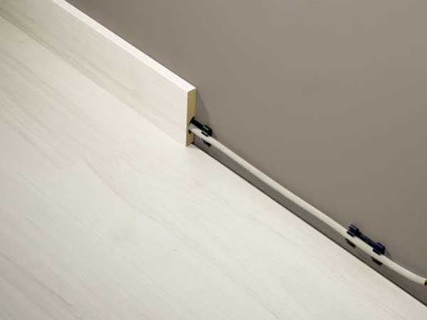 Несмотря на массивность широкого пластикового плинтуса, он с легкостью монтируется. Для его установки используется скрытый способ. На тыльной стороне плинтуса располагаются крепежные каналы, обеспечивающие совместно с замаскированными крепежными клипсами надежное крепление изделия.