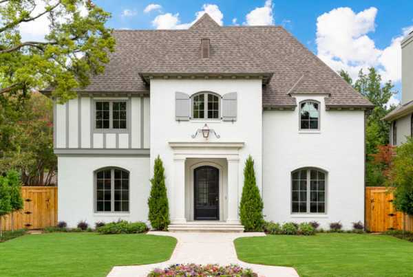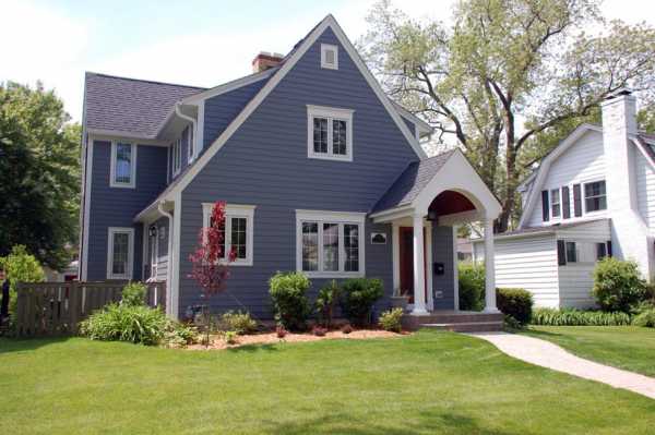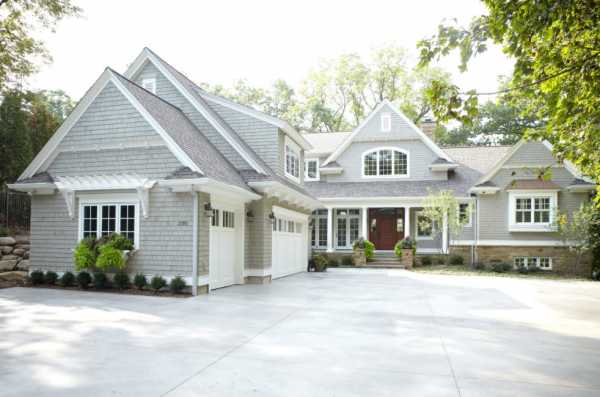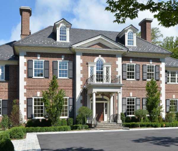 Дом в классическом стиле на фото — пример того, насколько красивой может быть колористика здания на базе тональных нюансов. Цельность внешнего вида здания достигается за счет комбинации голубовато-серой двухскатной кровли со светло-серыми кирпичными стенами.