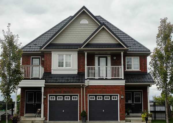Если фасад дома достаточно пестрый — бежево-коричневый, красно-белый, серо-рыжий — оптимальный вариант кровельного покрытия в таком случае, это металлочерепица ахроматического черного или серого цвета.