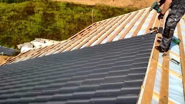 Если скат длиннее размера металлочерепицы для крыши, то необходимо произвести их стыковку по длине и сравнять торцы первых четырех. После чего закрепить саморезами.