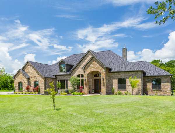 Бежевый декоративный камень, светлый фахверк, коричневая металлочерепица — все эти материалы прекрасно гармонируют с провинциальной стилистикой загородной усадьбы на фото.
