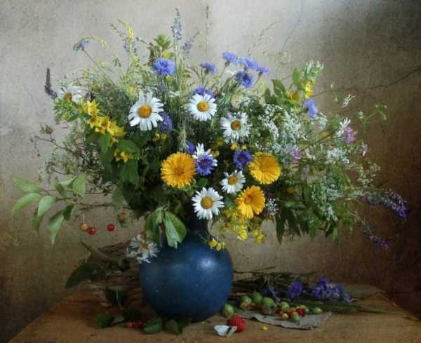 Цветы полевые и цветы оранжерейные, в красивых вазах и в обычной фаянсовой кружке.