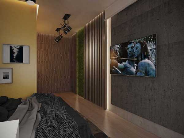 Эта комната необычна по цветовому оформлению: основной тон здесь задает насыщенный серый цвет. Единственным исключением из тональности является желтая стена возле кровати. Изображения из кинофильма «Аватар», размещенные на стенах, выдают неординарные черты личности хозяйки. Комната для девушки-подростка необычна и уникальна. Здесь создан свой собственный неповторимый мир, надежно оберегающий хозяйку от влияния внешних факторов.