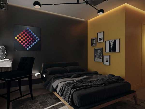 Использованы всего 3 цвета: желтый, белый и черный. Их композиция позволяет найти оригинальные мотивы для декорирования пространства и создает энергетическую атмосферу. Зеркальные светильники вносят элемент преобразования в прямые линии и делают обстановку действительно интересной.