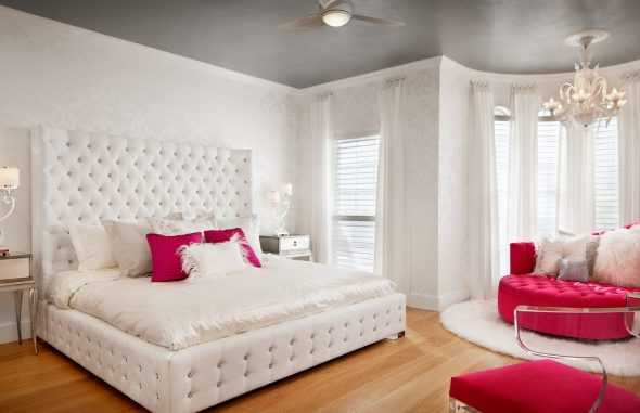 Спальня для настоящей леди с белоснежной кроватью с мягкой спинкой и мягкими пуфиками для гостей