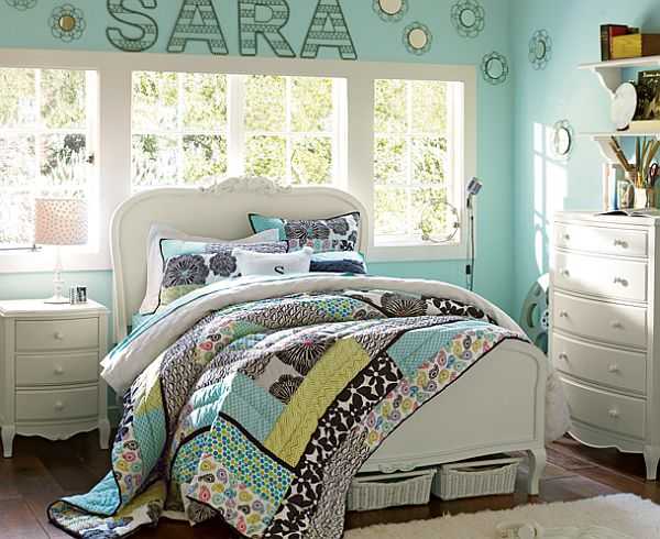 Интересная бирюзовая спальня для девочки в необычном оформлении