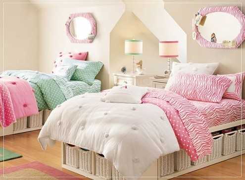 Если комната для двух девочек подростков, то необходимо для каждой выделить свое спальное место, рабочую зону и шкаф. У каждого ребенка должно быть свое личное пространство. Тогда у детей будет меньше поводов для ссор.