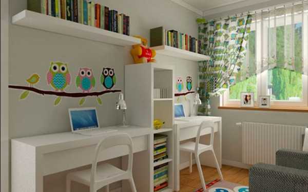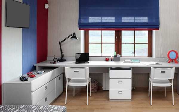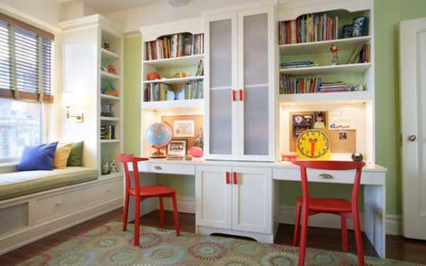 Декор в детской комнате для малышей обычно используется «милый»: флажки на стенах, яркие картинки и подушки, мягкие коврики. В комнате для двоих детей можно сделать стол с длинной столешницей, за которым могут разместиться оба школьника.