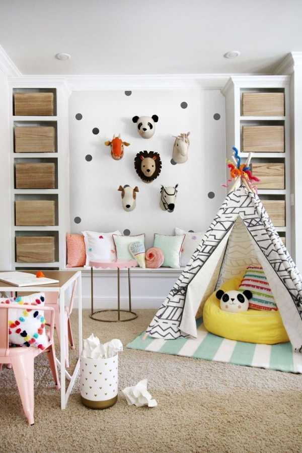 Очень важно предусмотреть достаточно места для хранения игрушек: их, как правило очень много и они разбросаны по всей комнате. Самым рациональным решением будет использование специальных коробок или корзин, в которые можно легко «свалить» кучу игрушек.