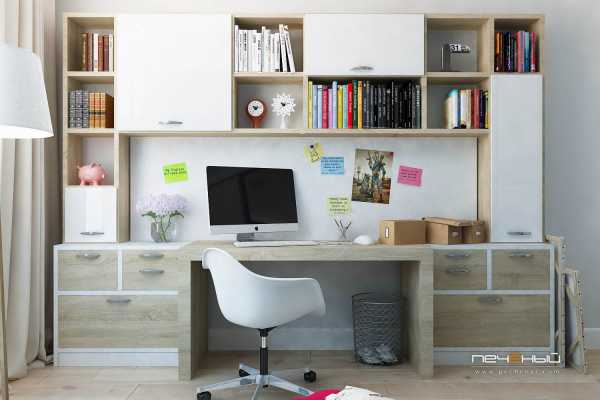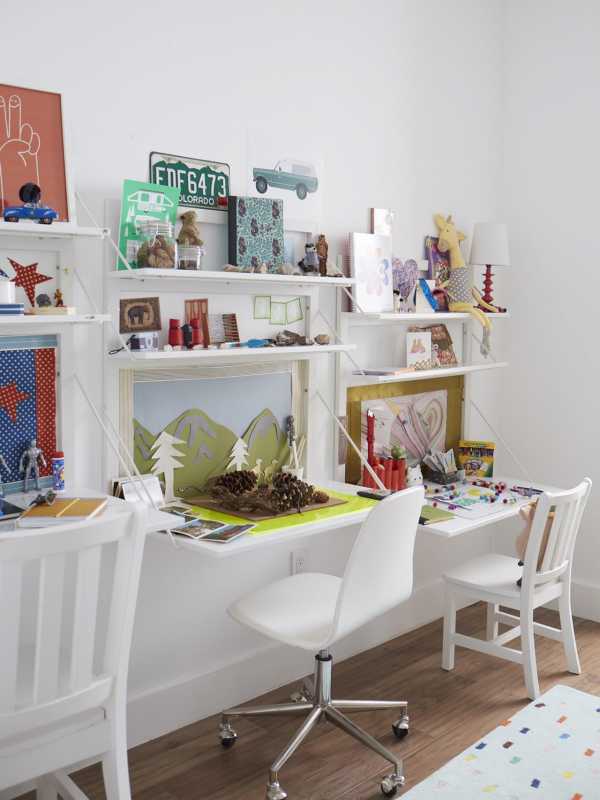 Можно выбрать также компактный компьютерный стол, который также может быть использован и родителями для работы на ноутбуке. Отличным вариантом является использование пространства возле подоконника, где можно установить столешницу. Длинная столешница подойдет и для двоих детей, а навесные полки позволят разместить все необходимое для учебы и повседневных творческих занятий. Стол у окна — это еще и яркий естественный свет.