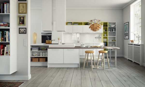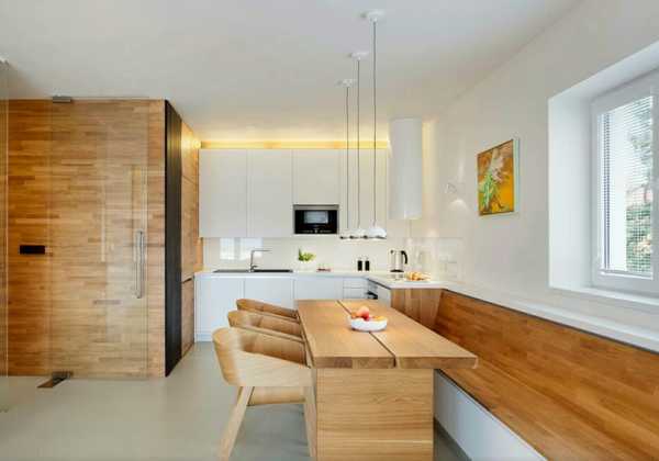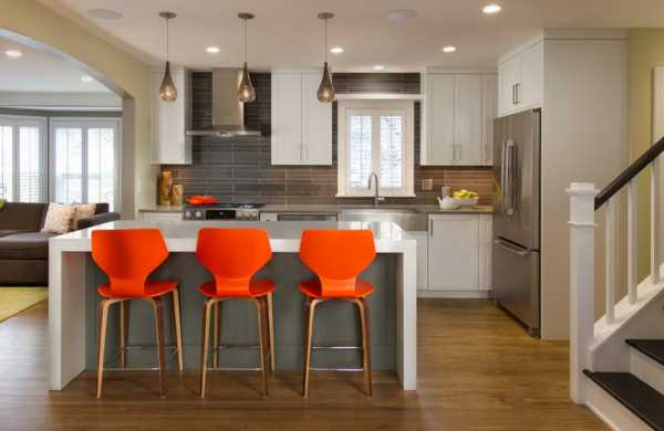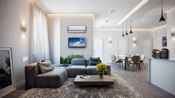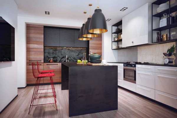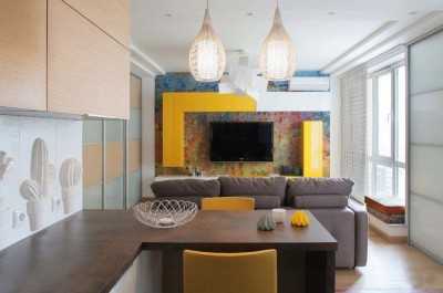 Дизайн модерновой кухни-гостиной с люстрой с подвесками
