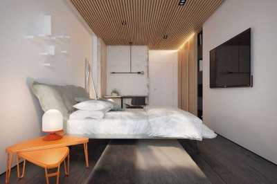 Но используя этот приём в дизайне квартир, следует обязательно учитывать не только размер, но и геометрию комнаты. Так, светлый акцент на общем темном фоне будет визуально отодвигаться от смотрящего – в итоге сравнительно узкое и длинное пространство покажется еще более длинным и узким. Тёмная же акцентная стена визуально будет ближе, а светлые боковые стены словно раздвинутся, добавляя объёма. Аналогичные эффекты достигаются и с использованием ярких цветовых контрастов – светлые оттенки и легкие рисунки словно отдаляют стену, а теплые, яркие насыщенные цвета – приближают.