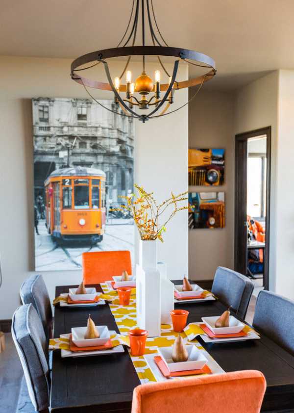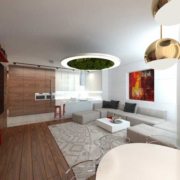 Не секрет, что в дизайне квартир в современном стиле используется минимум декоративных элементов. Однако, согласно фото новинок 2016, вопросам оформления и в таких минималистичных пространствах уделяется должное внимание. Лампы сложных геометрических форм, обилие прозрачных поверхностей, стильная дизайнерская мебель — этим список декоративных элементов в дизайне квартиры в современном стиле отнюдь не ограничивается. Разнообразить минималистичный дизайн-проект помогают яркие акценты, домашние растения и, конечно же, картины. В современных интерьерах художественные панно редко обрамляются в багеты. Здесь приветствуются картины, которые на первый взгляд кажутся совсем бессюжетными, а на самом же деле обладают весьма сложной концепцией. В представленном на фото выше интерьере кухни-гостиной частные дизайнеры Руслан и Мария Грин предложили раскрасить яркими красками нишу в белоснежной стене. На фоне светлых тонов такое панно выглядит особенно ярко.
