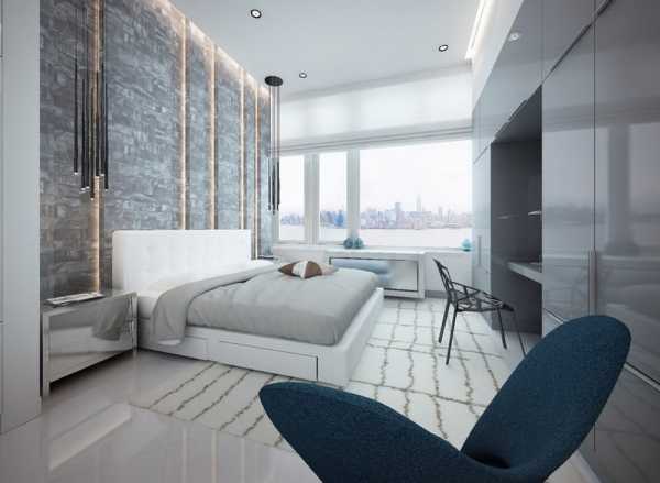 Дизайн спальни в квартире для молодого человека с черной глянцевой стеной
