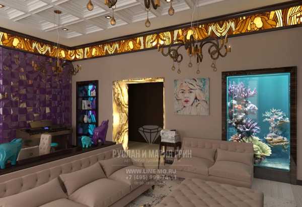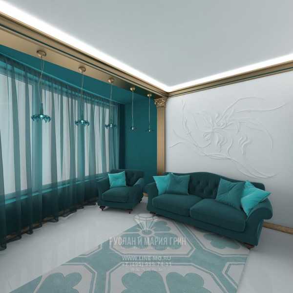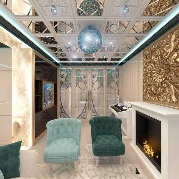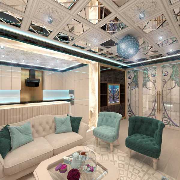 Дизайну потолка важно уделить должное внимание, ведь от этого во многом зависит общее восприятие интерьера гостиной комнаты. Так, с помощью тех же карнизов и подсветок можно визуально увеличить помещение в высоту. Необычные оптические эффекты в дизайне квартиры создают и зеркальные потолки. В интерьере, представленном на фото 2016, частные дизайнеры Руслан и Мария Грин используют кессоны, в декоре которых лепнина чередуется с фацетированными зеркалами. В сочетании с круглыми голубыми лампами, пущенной по периметру светодиодной подсветкой и люстрой в форме клубного шара такая отделка потолка создает в помещении необычный эффект.