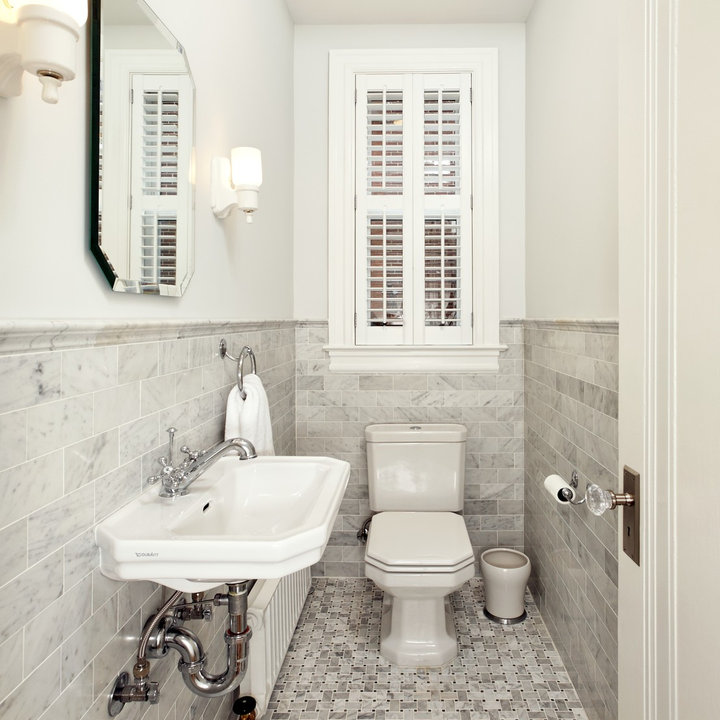 Идея дизайна: маленький туалет в викторианском стиле с подвесной раковиной, раздельным унитазом, черно-белой плиткой, серой плиткой, белыми стенами, мраморным полом и мраморной плиткой для на участке и в саду