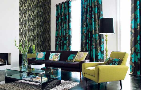 - В гостиную с высокими потолками подходят разноцветные портьеры с крупным рисунком. А набивные ткани сделают её роскошной и аристократичной. Цветочные мотивы и разные орнаменты придадут гостиной нарядный вид.