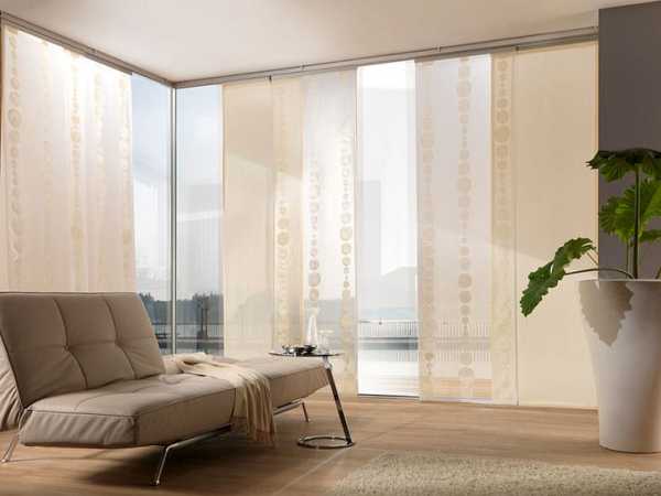 - Японские шторы. Они выглядят как панели, которые напоминают экран или ширму, закрывающие окно. Эти шторы можно комбинировать, сочетая тяжёлые и лёгкие ткани. Тканевые экраны — это лаконичный и модный вариант оформления. По вечерам они скрывают окно и сливаются со стеной либо, наоборот, придают интерьеру особую изюминку. Такие шторы эффектно смотрятся на больших оконных проёмах или дверях балкона.
