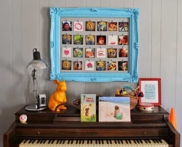 Если картины не вписываются в дизайн интерьера, но украсить жилье живописью хочется — то замените ее фото в крупной раме. К обратной стороне рамы приклейте несколько декоративных шнуров и на них прищепками зафиксируйте снимки.