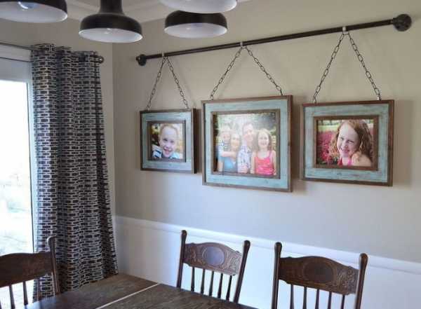 Повесить фото на стене, используя карниз и цепи — решение для самых смелых. Но зато такая композиция способна стать настоящей изюминкой интерьера. Эта идея хороша для крупных и ярких фото.
