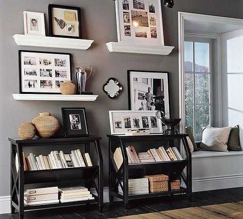 Узкие полки отлично подходят для размещения фото и картин. Также они позволят не делать лишние отверстия в стене. Если узкой полки не нашлось, то ее можно заменить широкими молдингами.