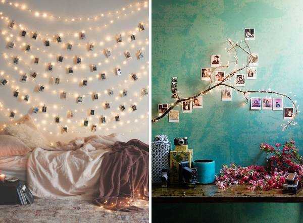 Веревочка и прищепки – пожалуй самый простой способ эффектного размещения фотографий