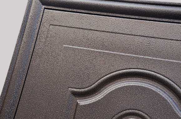 Покрытие молотково-трансферное предусматривает облицовку двери с наружной стороны молотковым способом, предотвращающим появление царапин и сколов. С внутренней стороны устраивается трансферное покрытие, позволяющее оформить железную дверь изнутри в соответствии с интерьером жилища.