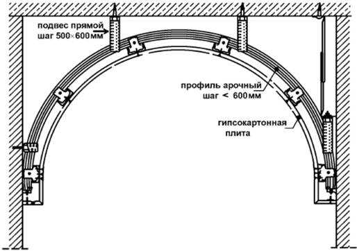 Дугообразный профиль прикрепляют к основной части каркаса - Чтобы дуги были надежно зафиксированы, их крепят подвесами к прямой направляющей, расположенной сверху. Число подвесов зависит от ширины проема. Обычно достаточно трех пар.