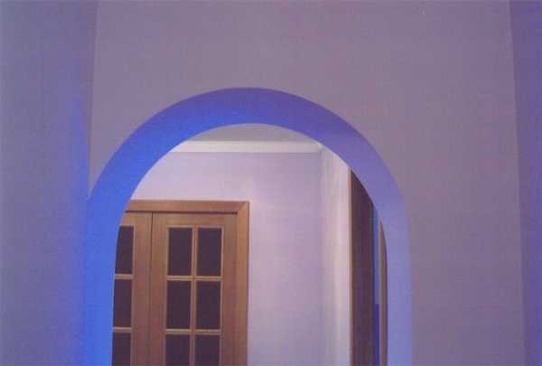 Декоративный проем можно снабдить углублениями, в которых будут установлены лампы. При необходимости подсветка может быть скрытой, в таком случае углубления закрываются полупрозрачным стеклом, нередко, цветным, являющимся самостоятельным элементом дизайна конструкции.