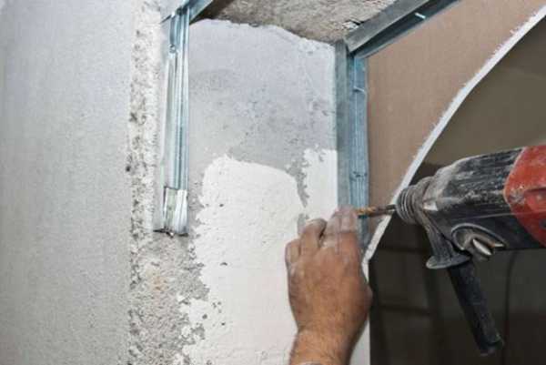 - По линиям проема дюбелями прикручивается контур из металлического профиля. Направляющие по вертикали устанавливаются с отступом от поверхности внутрикомнатной стены. Размер отступа равен толщине листа гипсокартона и слою штукатурки (около 0,2 см).