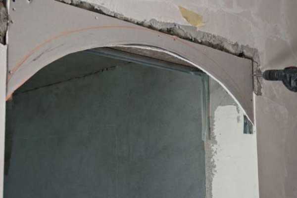 После установки каркаса принимаются за изгиб ГКЛ. Специалисты рекомендуют использовать гипсокартон, предназначенный специально для арочных конструкций. Он легко принимает нужную форму, если материал промять в продольном направлении.