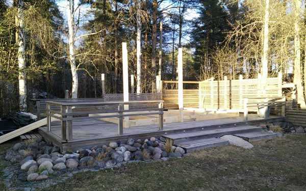 Для обустройства современного небольшого двора частного дома целесообразно сконструировать палубу или помост из древесины, на котором будет размещаться мебель.
