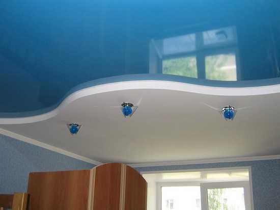Натяжные потолки не более 10 лет царят на рынке потолочных отделочных материалов. Конструкции из поливинилхлоридной пленки легки и в обслуживании, и в установке. Потому большая часть двухуровневых потолков на кухнях в России создана именно благодаря натяжным потолкам. Часто натяжные потолки бывают верхним уровнем, а гипсокартон нижним.