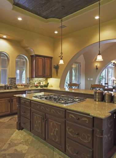 Типовая французская кухня с двухуровневыми потолками полностью соответствует нашим представлениям о стиле прованс