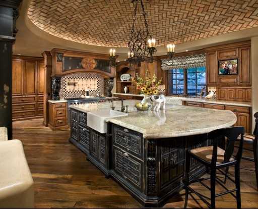 Редчайший вариант оформления двухуровневого потолка на кухне – это камень. Если каменные плитки расположены на потолке, да еще и укладка их необычна, создается полное впечатление, будто кухня находится в средневековом королевском замке.